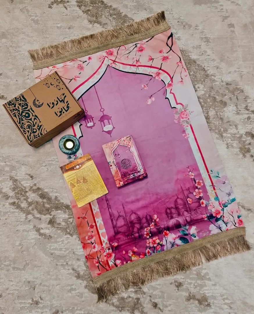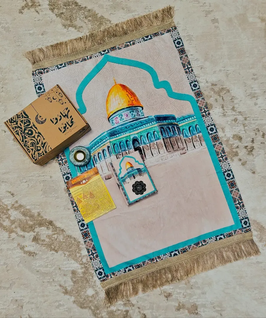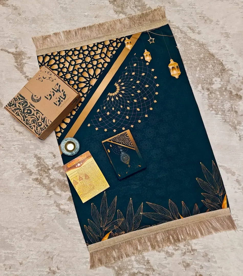 تصميم راقي يجمع بين الروحانية والفخامة، مع سجادة صلاة قطيفة بتصميم محراب أنيق وصندوق متكامل يعبّر عن الذوق والاهتمام بالتفاصيل.
